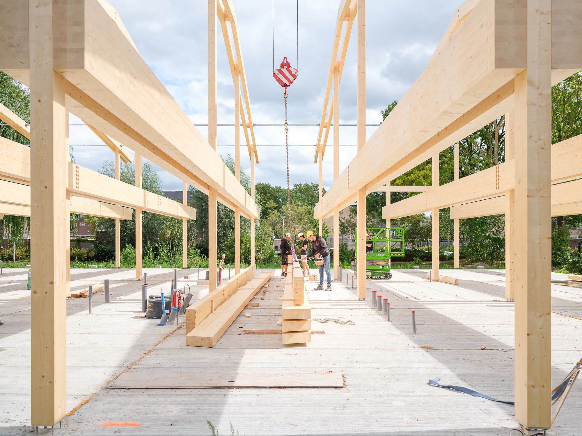 De constructie van het gebouw bestaat grote gelamineerde houten spanten met overspanningen van 10 meter. Deze spanten vormen overal zichtwerk en bepalen het karakter van het schoolgebouw. Door het toepassen van de spanten ontstaat inpandig een kolommenstructuur. Hiermee is een flexibele indeling te garanderen. Dit draagt bij aan de duurzaamheid van het gebouw op de lange termijn. Lokalen en functies kunnen eenvoudig worden uitgewisseld. De grotere lokalen op de begane grond passen binnen dit stramien en vormen samen met de kolommen op de verdieping een bufferzone tussen de lokalen en het leerplein. Dit stramien sluit ook perfect aan bij de ambitie om met hout te bouwen en zo CO2 op te slaan in het gebouw.